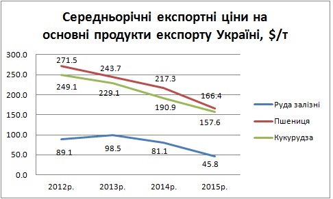 З графіка добре видно, що весь час кризи ціни на основні продукти українського експорту падали. У 2016-му вони припинили падіння і наприкінці року, навпаки, стали зростати. І експорт припинив падіння і наприкінці року став зростати також . Але середні ціни за рік виявились майже такими ж як і у 2015-му