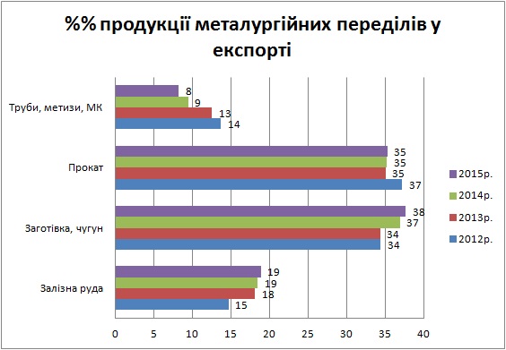 Статистика показує, що питома вага залізної руди за час кризи зросла до 19% експорту чорної металургії і не зменшується. Питома вага напівфабрикатів зростала з 34 до 38%, а у 2016-му зменшилась до 36% А от питома вага металовиробів продовжила падіння - колись було 14% всього експорту ЧМ, а у 2016р. тільки 7% Доля готового прокату збільшилась до 38% Таким чином за час кризи структура експорут погіршилась, а у 2016р. залишилась фактично без змін (щось трохи поліпшилось, щос навпаки)